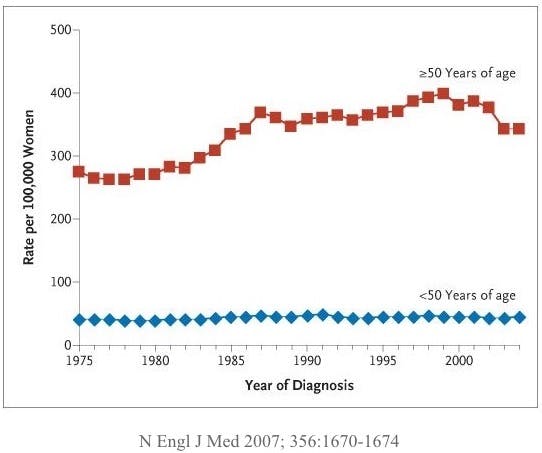 железы. Когда назначение ЗГТ в 1980-х и 1990-х годах увеличилось, рак молочной